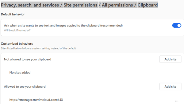- Check whether the Mavim Manager URL is listed under Not allowed to see your clipboard.