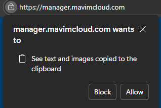 - When you visit Mavim Manager for the first time, Edge asks whether the site can access your clipboard.