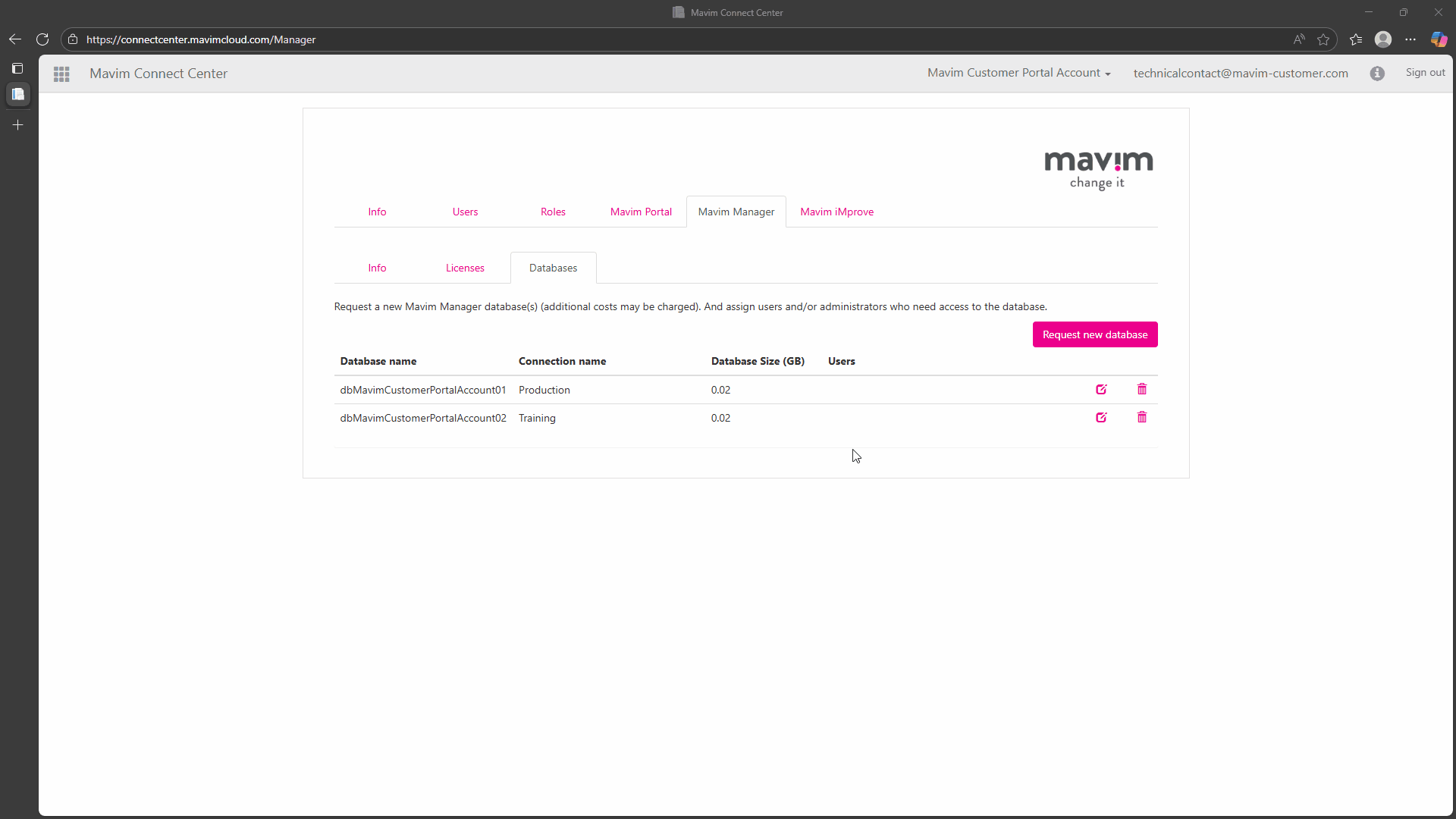 You are the Technical Contact for Mavim in your organization.
