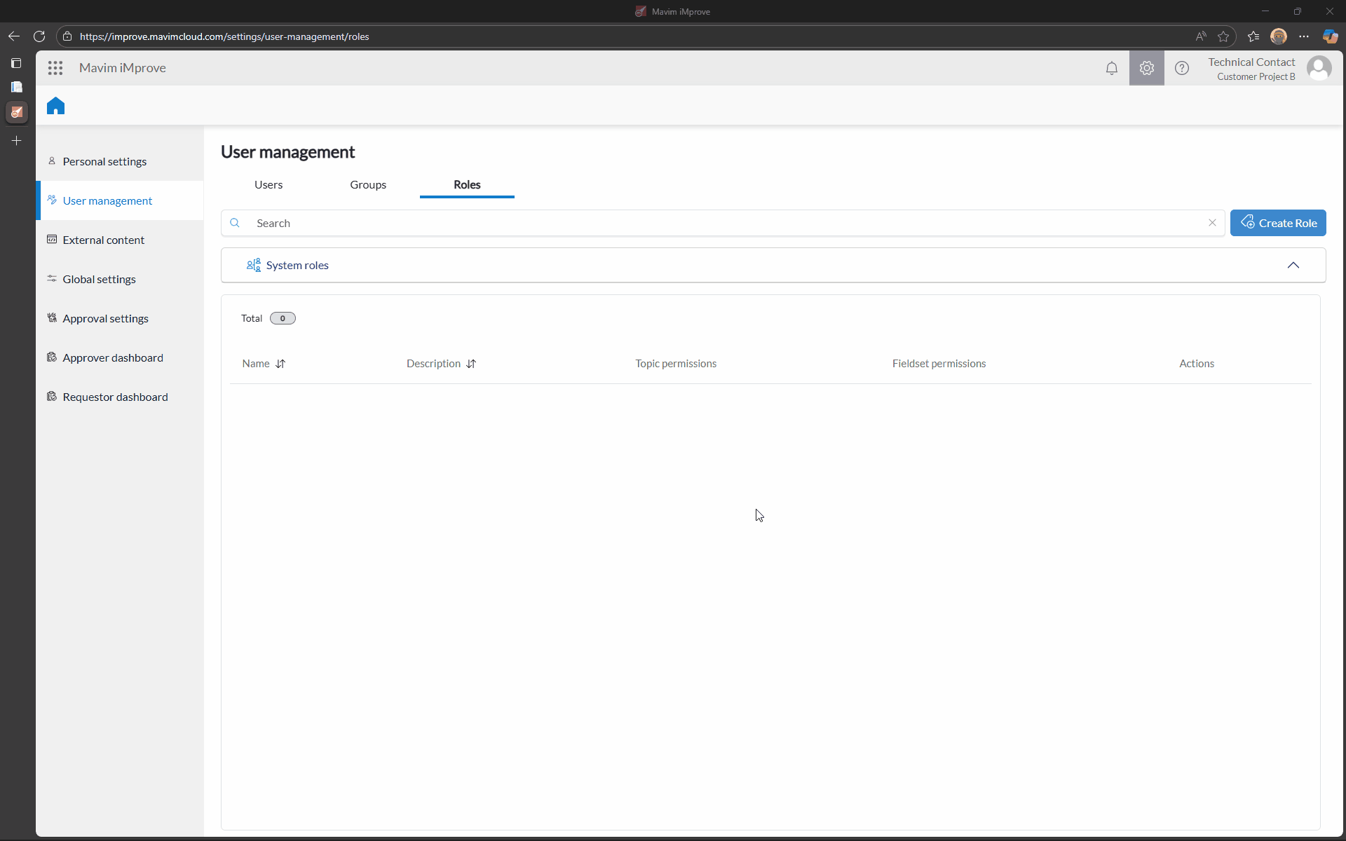 We distinguish 3 roles: the Customer Technical Contact sets up the permissions in the MCC and iMprove for the Partner Project Consultants and the Customer Contributor to work together on content in iMprove.