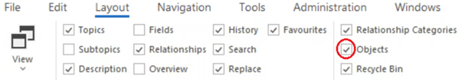 If you don’t see Objects under the yellow file cabinet, go to the Layout menu and check the box for Objects.
