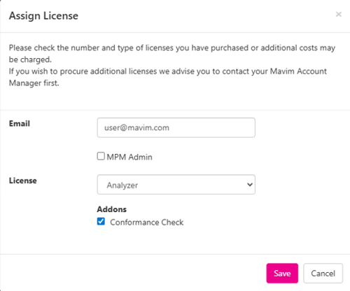 Select the appropriate Mavim Process Mining license type and any applicable add-ons.