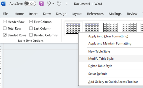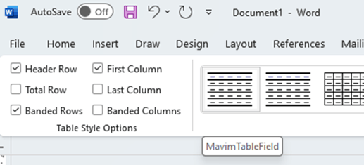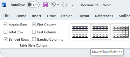 After inserting, the Table Design tab will appear. The first styles in the list are the Mavim custom table styles: