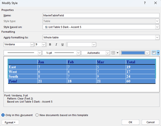 When you create a Word publication in Mavim, the tables use a default style defined in a template file. If you want your tables to have a different look, you can adjust the .dotm template file and upload it back into Mavim. This article explains how to update the table styles and apply them to your publications.
