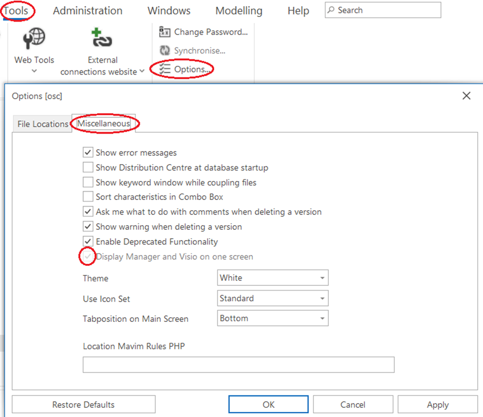To force both programs to open on the same screen, enable the Show Manager and Visio on one screen option in Mavim.