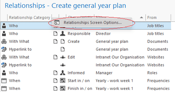 Right-click on any column header and choose Relationship Screen Options.