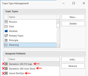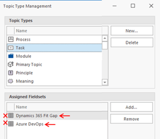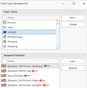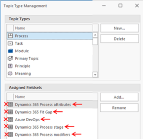 - For the topic types Process, Task, Module, Primary Topic, and Meaning, remove the Assigned Fieldsets.