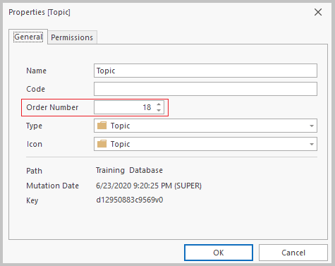 Topics in the topic tree are arranged according to an automatically assigned order number, which determines their position. You can view this number by pressing F4. When you change the order of topics, the order numbers are automatically updated to reflect their new positions.