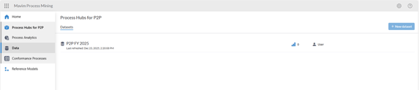 In Mavim Process Mining you can upload event logs to perform process mining analysis. In the Data section of a Process Hub you have an overview of the available datasets.