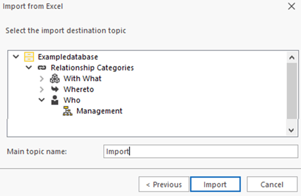 - Click Next, choose the location in the database where the import should occur, and specify the name of the main topic.