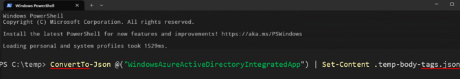 Execute command: ConvertTo-Json @("WindowsAzureActiveDirectoryIntegratedApp") | Set-Content .temp-body-tags.json