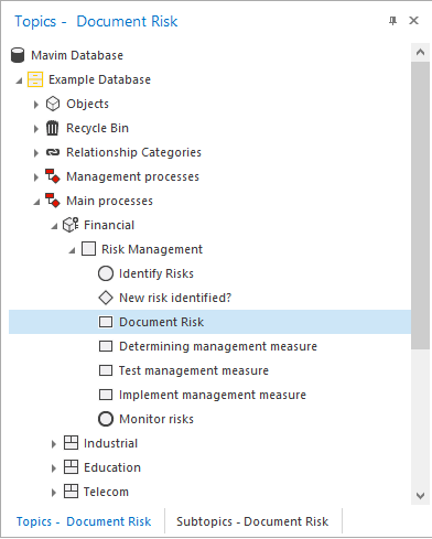 Topics can be added manually or by importing information from an external source such as a Word document or a version from another database. Several elements in the tree structure however are a default part of any Mavim Manager database: