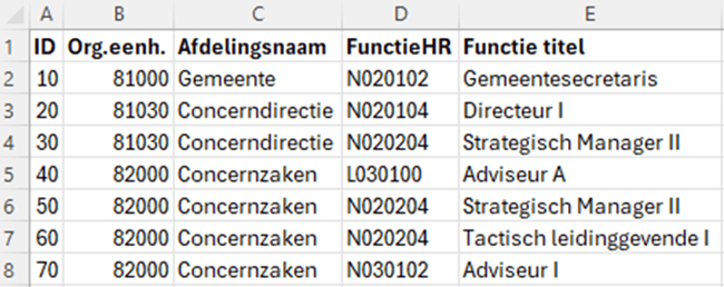 - Zet hiervoor alle hoofdonderwerpen (Afdelingsnaam) ook in de kolom Functie titel.