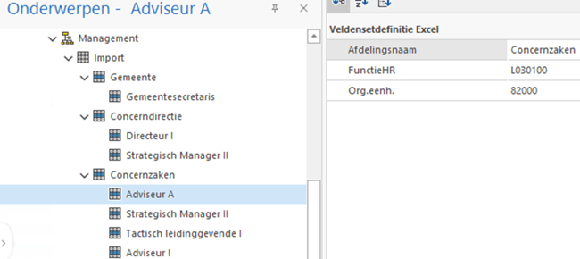 In de Manager moet de kolom ‘Functie titel’ als topic naam terugkomen onder de hoofdtopics die onder ‘Afdelingsnaam’ vermeld staan.