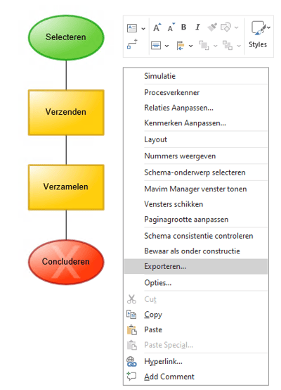 Dit artikel legt uit hoe je gegevens en schema's uit Mavim kunt exporteren naar verschillende formaten, zoals XML, Word en Visio (.vsdx).