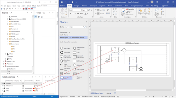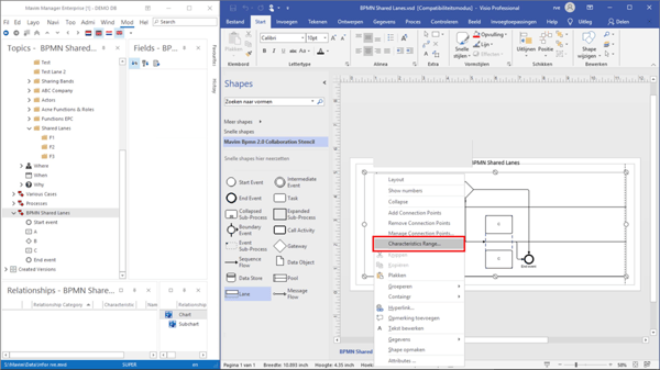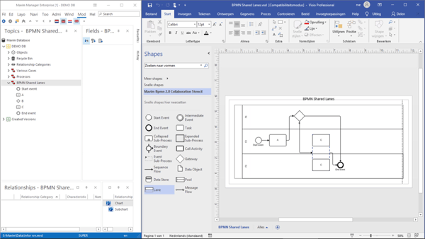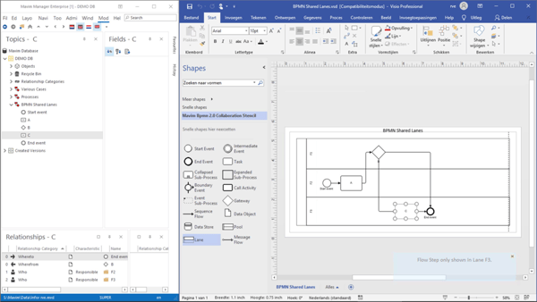 Uitleggen hoe je BPMN-Collaboration kunt combineren met kenmerken zoals Responsible, Accountable, Informed in Mavim, en hoe je de weergave in lanes kunt beheren.