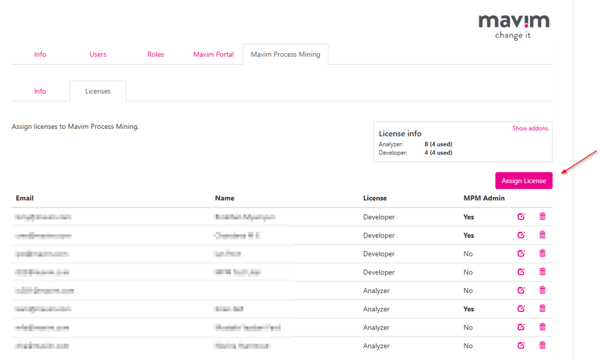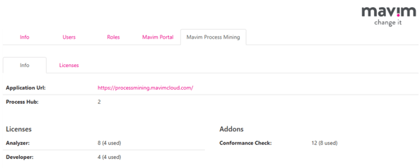 Licenties voor Mavim Process Mining toewijzen in Mavim Connect Center