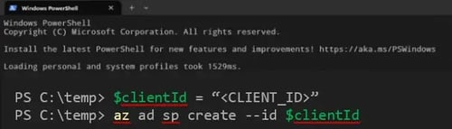 Voer in PowerShell de volgende opdracht uit om een variabele voor ClientId in te stellen die de waarde van de ClientId van de Enterprise-toepassing/Service Principal bevat. Deze waarde kan later opnieuw worden gebruikt.