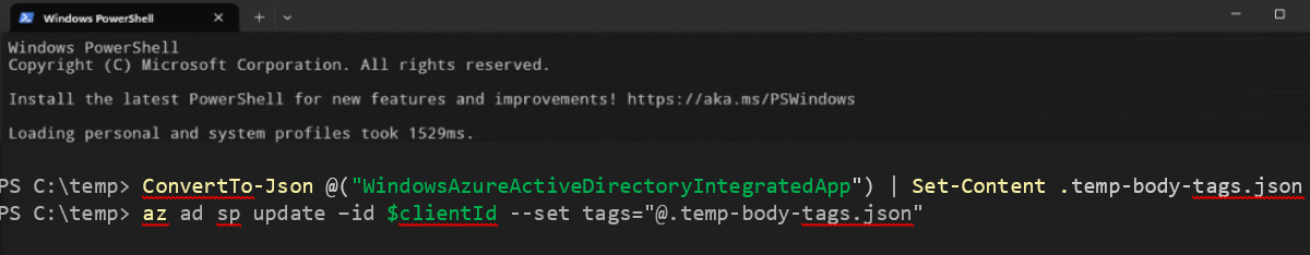 Commando: az ad sp update --id $clientId --set tags="@.temp-body-tags.json"
