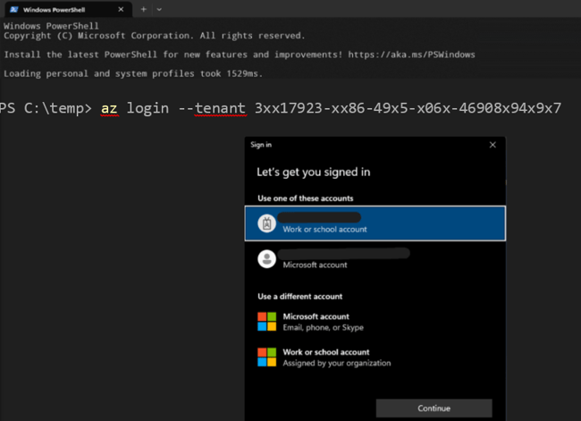 Vervang de placeholder voor 'tenant-ID' door de tenant-ID van Microsoft Enterprise ID waarin u de service-principal wilt installeren. Druk op de Enter-toets om het pop-upvenster voor meervoudige authenticatie te openen. Ga verder met de authenticatie en voltooi het proces om u aan te melden bij de Azure-tenant.