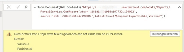 In de meeste gevallen wordt deze foutmelding veroorzaakt door een authenticatieprobleem bij het ophalen van de JSON data uit de Mavim Portal. Power BI krijgt dan geen geldige JSON terug, maar een foutpagina of HTML, waardoor de parser “extra tekens” ziet.