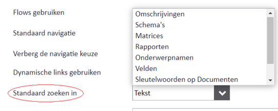De Portal Administrator kan op het tabblad Algemeen instellen welke zoekoptie standaard getoond wordt via het veld Standaard zoeken in.
