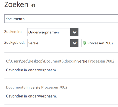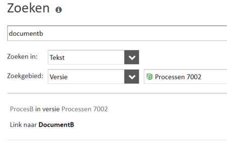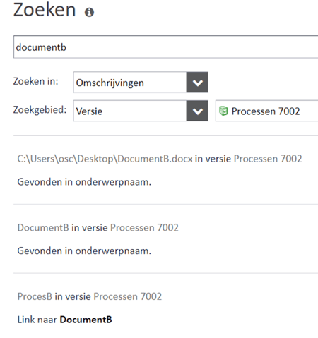 Zoeken op documentb in Omschrijvingen binnen de versie Processen 7002 levert 3 resultaten op: